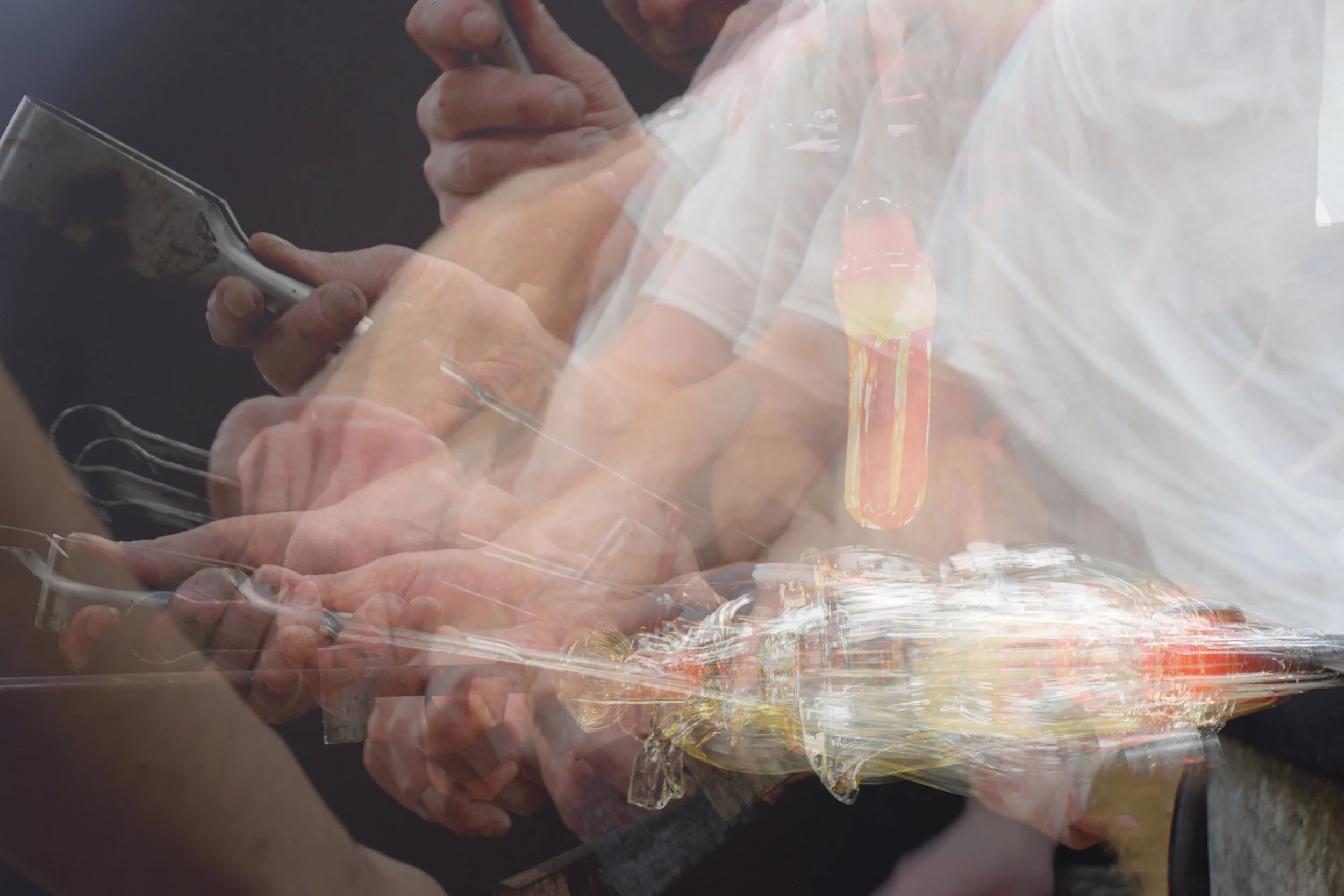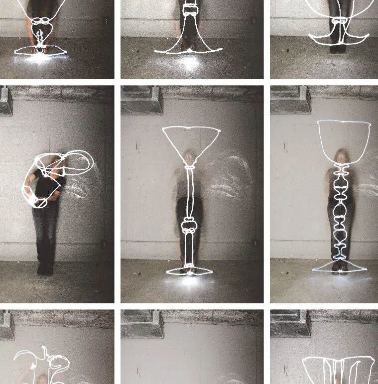 Your glass objects will be reinterpreted as slow exposure light drawings. The performative and gestural lines and the spectral image of the body, creates a gestural index of your collection.